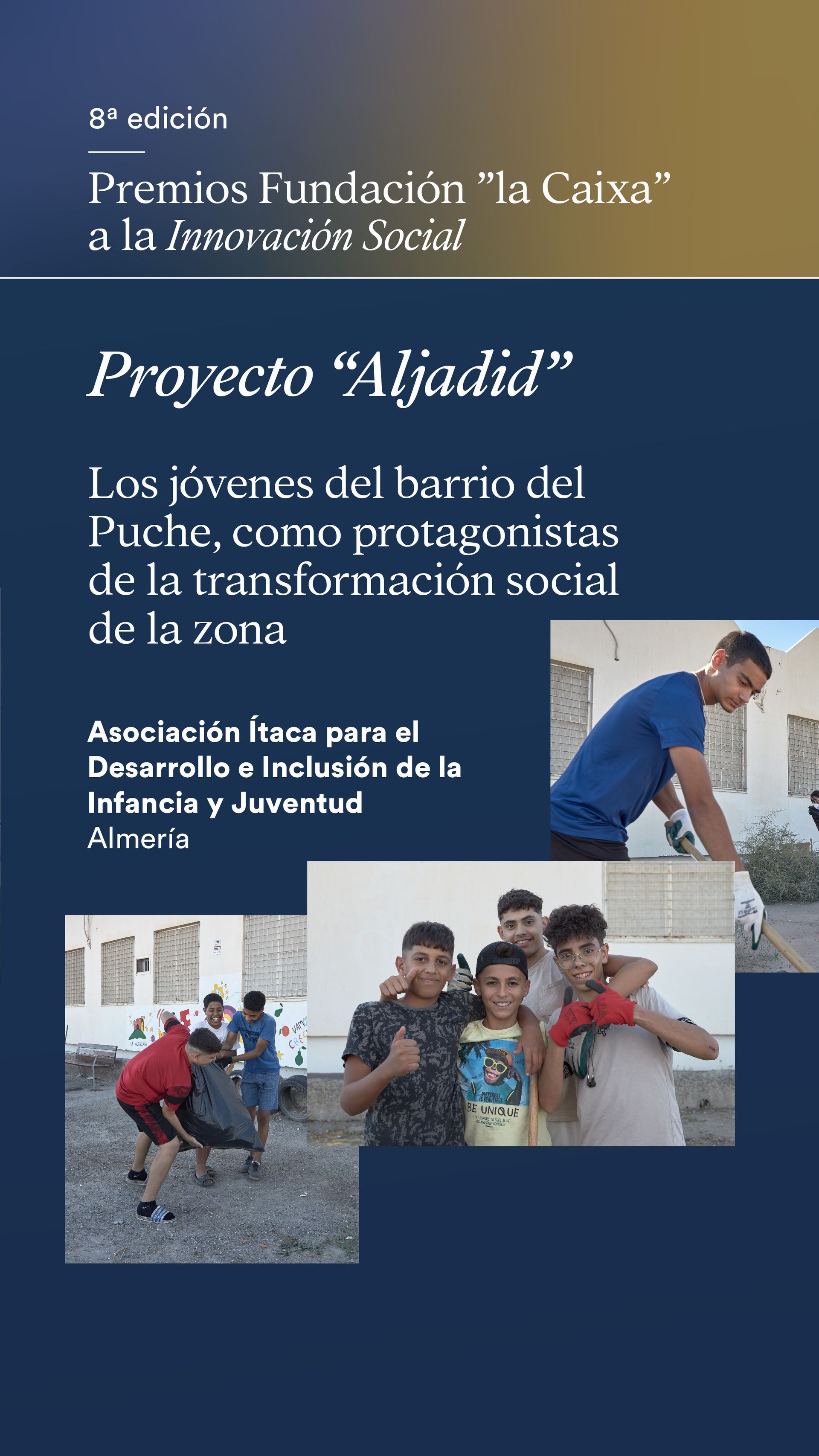 reconoció 12 proyectos sociales destacados por abordar retos como la cohesión social, la lucha contra la pobreza y la inclusión de personas vulnerables entre más de 3.000 proyectos de las convocatorias de Proyectos Sociales de la Fundación 'la Caixa' otorgando el reconocimiento al Proyecto "Aljadid, nuevos caminos"